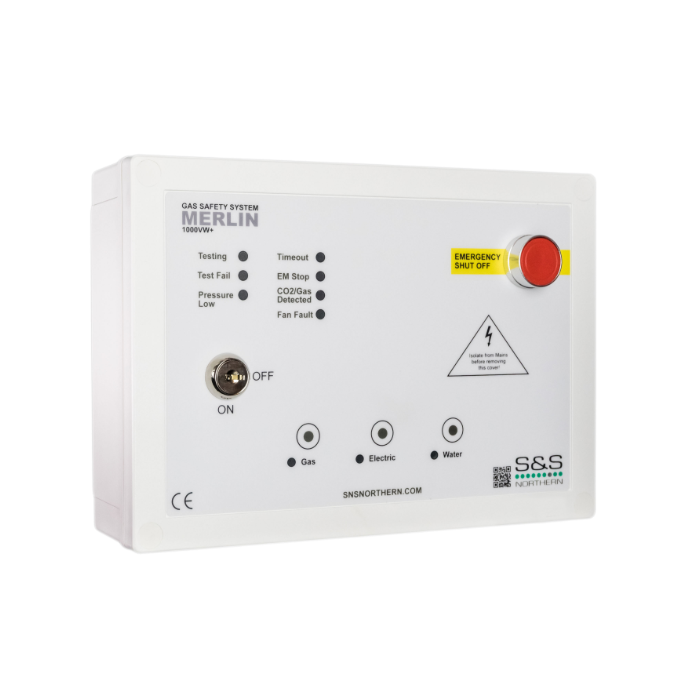 The gas pressure is tested using a unique digital transducer ensuring there are no open gas taps and no gas leaks. In built connectivity allows for connections to existing fire alarm and building management systems and with its easy to use system status panel and labelled PCB the Merlin 1000VW+ is easy to install and easy to operate. Another main feature of the Merlin 1000VW+ is the facility to interlock between the ventilation system and the gas solenoid valve. The system is compatible with both current monitors and air pressure differential switches in order to interlock with up to 2 fans.
