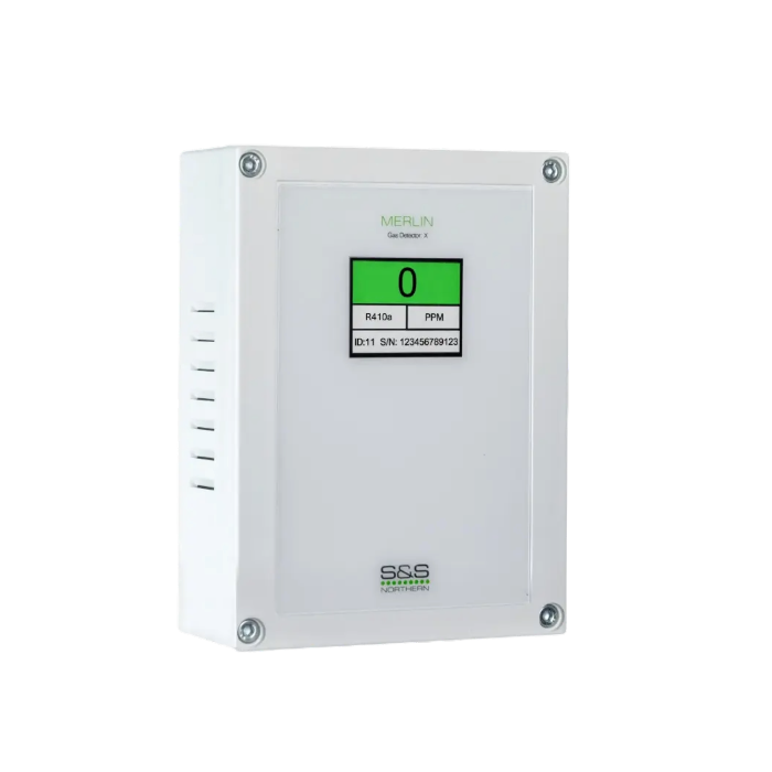 The Merlin Refrigerant Detector X is an NDIR detector, commonly used as a standalone unit or integrated with a Merlin controller. The target refrigerant gases are heavier than air, meaning they will settle, so the sensor should be installed 12 inches from the floor in the protected area. Upon detection, the unit will trigger an alarm at 1000ppm. When connected to a Merlin controller, the built-in alarm relay outputs can activate a remote audible alarm and control ventilation fans. Once the leak is addressed, the sensor head will clear, and the Merlin panel and detector can be reset.